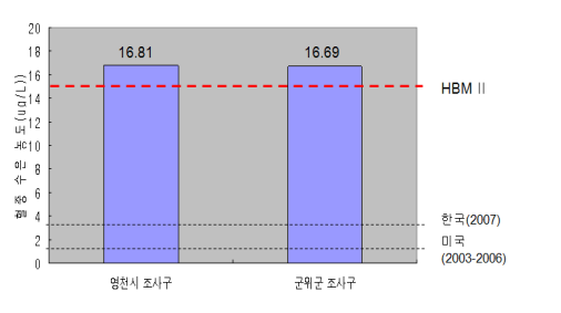 지난해 2월부터 12월까지 성인남여 119명(평균연령 68세)을 대상으로 혈중 및 요중 수은농도를 조사한 결과에 의하면, 혈중 수은농도는 기하평균이 16.69~16.81㎍/L로 나타났다.