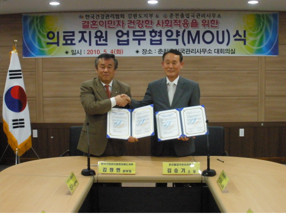범무부 춘천출입국관리사무소(김승기 소장)와 한국건강관리협회 강원도지부(김정현 본부장)은 4일 춘천출입국관리사무소에서 경제적으로 어려운 결혼 이민자를 대상으로 건강검진서비스지원을 약속하는 업무협약을 체결했다.