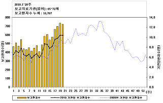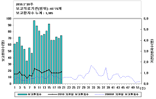 올 5월 9일~5월 15일(20주) 동안 보고된 환자 수가 721명 (보고기관 당 환자수 10.4명)으로 이전 4주간 보고된 환자수의 평균치(667.5명)보다 8.01% 증가했다.