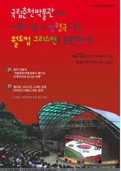 국립춘천박물관(정성희 관장)은 야간 연장 개관을 통해 특별행사로 ‘국립춘천박물관에서 가족과 함께 인형극도 보고, 월드컵 그리스전도 응원하자!’를 마련하였다고 8일 발표하였다.