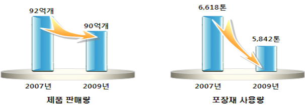 이는 2009년도에 해당 제품군들의 총 판매량은 2007년도 대비 약 2% 정도 줄어든 반면, 상대적으로 포장재 사용량은 12%나 줄어 그간 업계의 지속적인 포장재 감량화 및 포장재 재질개선 노력이 결실을 맺은 것으로 평가됐다.