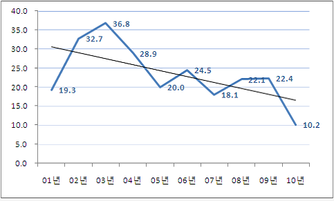 2003년에 약수터 380개소 중 140개소(36.8%)가 부적합판정을 받아 최고의 부적합률을 기록한 후 계속 개선돼 금년 검사결과 1/3이하로 낮아졌다.