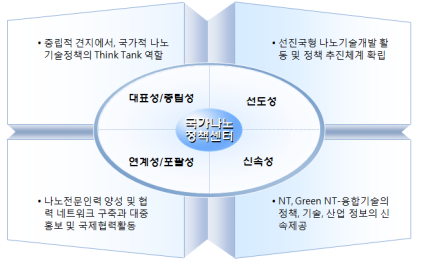 나노기술정책센터는 ‘나노기술종합발전계획’을 포함한 나노분야 중장기 정책 수립 지원 △유망기술 도출을 통한 미래 전략핵심 기술 과제 발굴 및 정책동향 연구 △ 나노분야 정보 수집 및 분석 지원 △ 국제협력 사업 및 인력양성을 통한 연구성과 확산 등을 수행 할 예정이다.