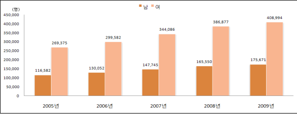 성별로 살펴본 결과, 연도별 전체 진료인원을 100으로 보면 남성 환자의 점유율은 약 30%였으며, 여성 환자의 점유율은 약 70%로, 여성 진료인원이 남성의 2.3배로 나타났다.