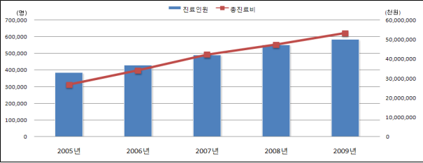 2009년을 기준으로 70세 이상의 점유율이 21.1%로 가장 높았으며, 60대 19.9%, 50대 19.7%, 40대 17.1%의 순으로, 40세 이상이 전체 진료인원의 77.7%를 차지했다.