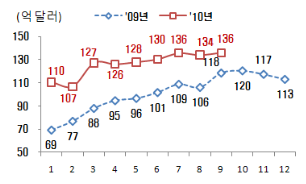 [시사투데이 신경화 기자] 국내 IT 수출 및 수지가 지난 7월 사상 최대치를 동반 달성한데 이어 또 다시 동반 최고 실적을 기록했다. 지식경제부는 9월 IT 수출이 전년 동월대비 14.9% 증가한 136억 달러(종전 7월 135.6억 달러) 및 IT 수지가 70.8억 달러 흑자(종전 7월 69.9억 달러)로 사상 최대치로 잠정 집계됐다고 5일 밝혔다. 반도체, 스마트폰 수출이 사상 최대치를 기록한 가운데 디스플레이 패널은 16개월 연속 수출 증가세를 이어갔다.