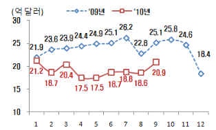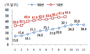 국가별 수출로는 중국(홍콩포함, 62.1억 달러, 20.9% 증가), 미국(16.1억 달러, 21.2% 증가), 대양주(0.9억 달러, 11.8% 증가) 등을 대상으로 두 자릿수 증가율을 기록했으나, EU(16.1억 달러, 3.8% 증가), 일본(7.1억 달러, 5.9% 증가)은 휴대폰 수출 감소로 증가율이 다소 둔화됐다.