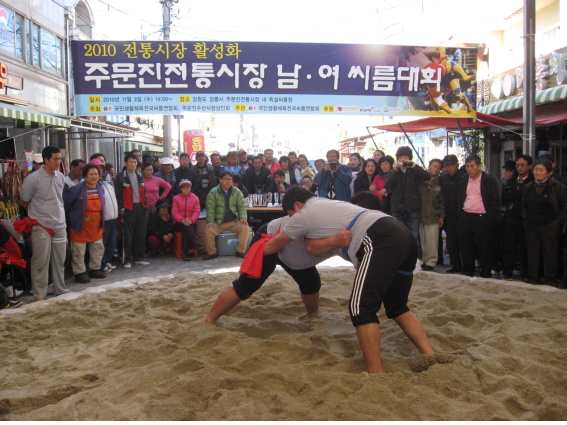 주문진 전통시장 남녀 씨름대회는 지난 2008년부터 2년간 문화체육관광부의 문전성시(문화를 통한 전통시장 활성화) 시범사업이 진행된 주문진전통시장에서 이번에는 전통문화체험이라는 테마로 시민들의 참여 씨름대회를 진행하게 이르렀다.