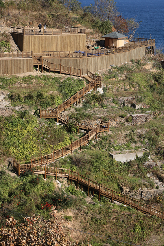 동해시 묵호동 소공원은 지난 4월부터 일자리창출 사업의 일환으로 재해위험지구를 정비하고 무질서하게 방치된 건축물 잔해를 정비한 후 나무테크를 이용해 등산로를 설치하고 등대와 연결하는 새로운 관공코스로 만들어졌다.