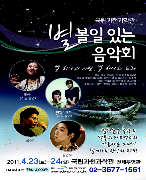 [시사투데이 정미라 기자] 국립과천과학관은 과학의 달을 맞이해 오는 23일과 24일 양일간 오후 4시 30분부터 ‘별 하나의 사랑, 별 하나의 노래’ 콘서트를 개최한다. 이번 콘서트는 국내 최대 규모의 천체투영관(planetarium)돔 스크린에 우주의 신비한 모습을 담은 천체영상과 함께 최고의뮤지션이 관객들에게 색다른 음악회를 선사하기 위해 마련했다. 폭발적인 가청력과 한국 여성 보컬리스트 대표 주자 이자 소울의 대모 BMK의 공연을 시작으로, ‘막심므라비차’를 꿈꾸는 크로스오버 팝 피아니스트 최수민, 슈퍼스타 K가 낳은 영혼을 울리는 목소리의 주인공 김현지, 그리고 별과 자연을 노래하는 유쾌하고 감미로운 음악가 ‘여행스케치’와 함께 특별한 음악세계로 빠지게 된다. 콘서트는 단순히 음악을 감상하는 차원을 넘어 관객들에게 과학적 상상을 풍부하게 만들어 주는 좋은 기회가 될 것으로 보인다. 콘서트 관람 예약은 과학관 홈페이지(www.scientorium.go.kr)를 통해 오는 16일 오전 00시부터 인터넷 예약(250매)으로 신청할 수 있다.