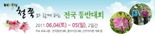 [시사투데이 김준 기자] 태백시는 오는 6월 4일과 5일에‘철쭉과 함께하는 태백산전국등반대회’를 민족의 영산 태백산에서 열린다고 태백시축제위원회가 밝혔다.