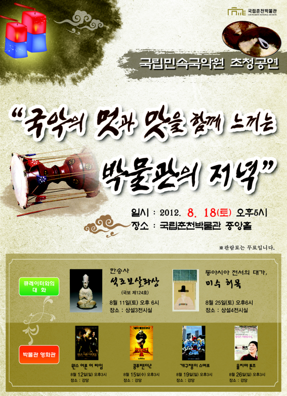 시사투데이 김준 기자] 국립춘천박물관은 개관 10주년을 기념해 오는 18일 오후 5시 국립춘천박물관 중앙홀에서 특별한 초청무료공연으로‘국악의 멋과 맛을 함께 느끼는 박물관의 저녁’이란 주제로 국립민속국악원의 공연을 마련했다고 16일 밝혔다.