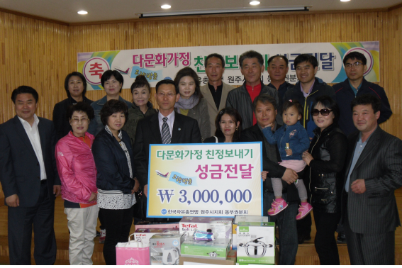 동부권분회 소속회원 35명은 원주시에 거주하는 다문화가정 가운데 형편이 어려워 친정 나들이를 하지 못한 가정을 지원하기 위해 지난 2011년 3월부터 폐지, 고철 등 재활용품 수거 활동을 벌이고 젓갈, 미역 등을 판매해 전달식을 마련했다.