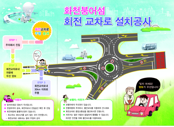 화천군청 건설방재과 도로담당은 “회전교차로는 교통사고가 잦은 장소나 신호등 설치로 교통 흐름에 불편을 주는 곳에 설치하면 효과적이다”며 “붕어섬 입구는 축제기간에는 시간대별로 밀리는 차량선이 있어 통행에 불편을 주고 있고, 상리 헌병초소 사거리는 접촉사고 등 교통사고가 빈번히 일어나고 있어 회전교차로를 설치하게 됐다”고 말했다.