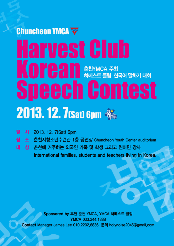 시사투데이 김준 기자] 춘천YMCA하베스트클럽은 한국에 들어와 살고 있는 외국인들에게 한국어의 우수성과 사회 안에 자리 잡고 구성원으로서의 자부심을 고취시키기 위해 오는 12월 7일 춘천시청소년수련관 1층 공연장에서 ‘제1회 하베스트 클럽 한국어 말하기 대회’를 개최한다고 19일 밝혔다.