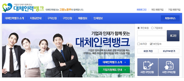 대체인력뱅크를 이용하려면 온라인 사이트(http://matchingbank. career.co.kr 또는 www.대체인력뱅크.com)로 접속해 대체인력 구인·구직신청을 하거나 대체인력 종합지원센터(전화 02-2006-6195)로 방문하면 된다.