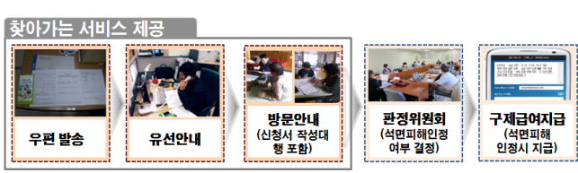 올해 ‘찾아가는 서비스’는 고령, 중증(암)환자 등 거동이 불편한 석면 건강피해 의심자 또는 석면질환 사망 의심자의 유족이 요청하면 환경공단 담당 직원이 신청서 작성과 구비서류의 발급 등을 대행해 주는 ‘해피콜 서비스’를 도입했다. 또한 기존의 석면 피해 인정자에 대한 건강관리 확인, 구제급여 신청서 작성대행, 제도개선 요구사항 수렴 등의 종합적인 사후관리도 함께 이뤄진다.