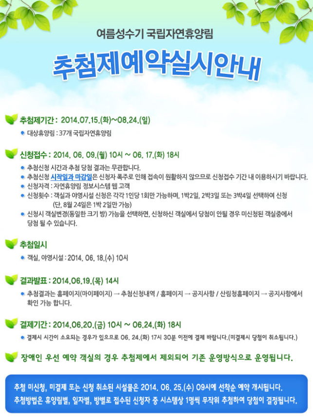 자세한 사항은 국립자연휴양림관리소 누리집(http://www.huyang.go.kr) 공지사항을 참고하거나 국립자연휴양림관리소 전화상담실(☎1588-3250)로 문의하면 된다.