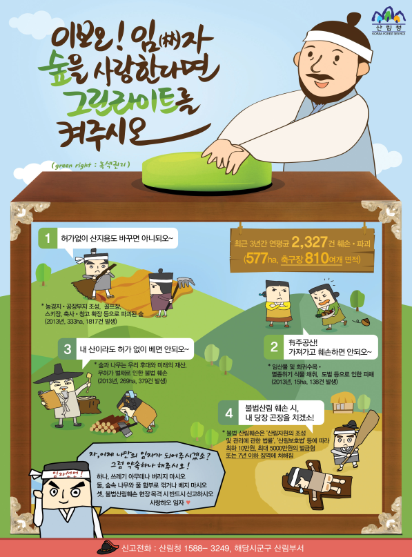 최근 3년 간 불법산림 훼손 발생 건수는 연평균 2327건으로 피해가 심각한 상황이다. 규모로 따지면 연간 577ha다. 매년 축구장 약 810개 면적의 숲이 불법으로 훼손되고 있는 셈이다. 농경지, 공장부지, 골프장 조성과 관련한 불법 훼손이 1817건(2013년도 기준)으로 가장 많고 무허가 벌채, 도벌, 임산물과 희귀수목 불법 채취가 그 뒤를 따르고 있다.