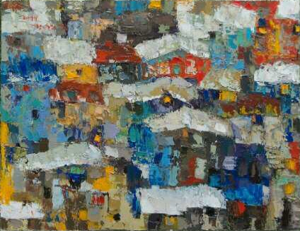 특히 서로 머리를 맞대고 줄지어 이어지는 한옥 집의 지붕들은 언제나 정겨운 풍경으로 그립고 아늑한 추억을 간직한 채, 선과 색이 돼 보는 이로 하여금 추억과 향수를 불러일으키고 겹겹이 칠해진 물감들은 흙담집의 벽처럼 감촉을 느끼게 한다.