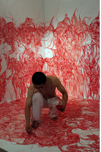 시사투데이 김준 기자] 안영태(서양화) 작가는 드로잉 속에 들어가 퍼포먼스를 통해 작품을 펼친다. 그는 밑그림이 없는 하얀 공간 속에 서서 붉은 색 물감이 들어 있는 컵과 가는 붓을 들고 공간을 분할하고 연결하며 붉은색 곡선으로 뒤덮기 위해 오는 21일부터 30일까지 메이준 갤러리에서 ‘긋다’展을 연다.