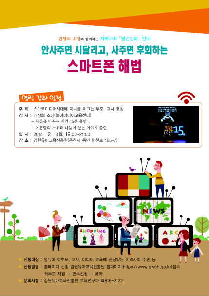이번 강좌는 오는 12월 1일 오후 7시 강원유아교육진흥원1층 대강당에서 ‘스마트미디어시대에 자녀를 이끄는 부모, 교사 코칭’이라는 주제를 가지고 권장희 소장이 강의식으로 진행된다.