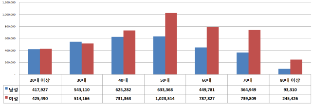 진료인원 중 가장 많은 비중을 차지하는 연령대는 50대, 40대, 60대 순으로 나타났다. 50대 여성은 100만명으로 전체 성별·연령대별 인원 중 가장 많았고 이후 60대, 70대 순으로 고령층의 진료이용이 높았다. 특히 70대 여성은 남성의 2배 많은 것으로 나타났다.