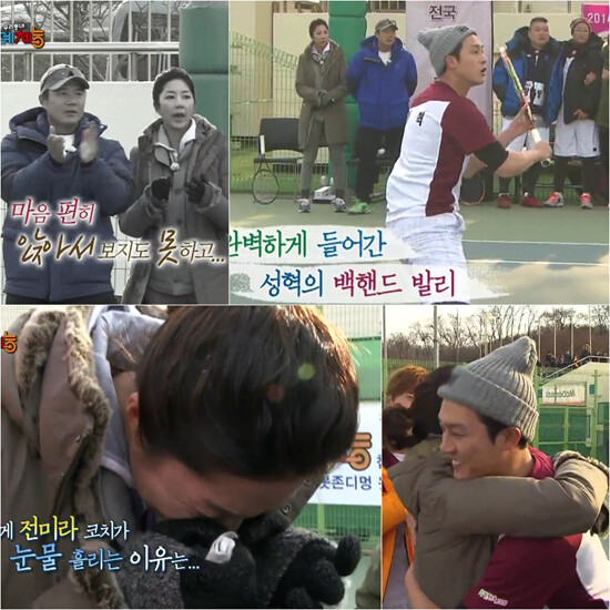 이 날 경기도 팀과의 경기에서는 폭풍눈물을 흘리는 전미라 코치의 모습이 포착되며 시청자들의 눈물샘을 자극했다. '예체능' 테니스 팀은 첫 경기 이재훈-양상국의 승리에 이은 강호동-신현준의 아쉬운 패배, 이어 정형돈-성시경의 짜릿한 역전승까지 2:1의 상황이었다. 그 가운데 마지막으로 네트에 선 팀이 바로 성혁-이광용 조였다.