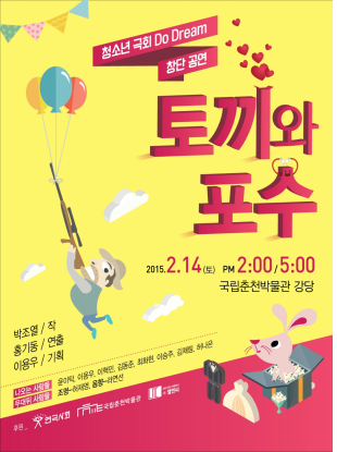 또한 박물관 영화관에서는 오후 3시 설 특선영화로 호튼(18일), 몬스터대학교(19일), 넛잡: 땅콩도둑들(20일), 겨울왕국(21일), 오세암(22일)이 상영된다. 특히 오는 14일 오후 2시와 5시 두 차례에 걸쳐 청소년들이 주축이 돼 만든 연극 ‘토끼와 포수’가 공연 된다. 이번 공연은 청소년 극회 ‘두드림’이 같은 또래 청소년들이 격고 있는 고민들에 대해 함께 공유하고 소통하는 자리가 될 것이다.