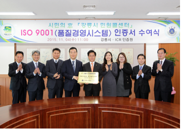 시는 민원콜센터 운영 및 상담서비스 분야에 대해 지난달 30일 문서심사와 현장심사를 거쳐 인증취득이 최종 확정돼 지난 4일 인증기관인 ICR 인증원장으로부터 최명희 강릉시장이 인증서와 현판을 수여 받았다.