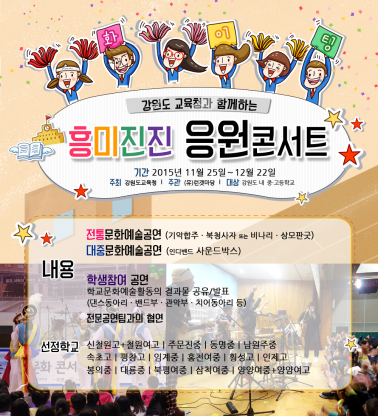 이번 흥미진진·응원콘서트에 선정된 강원도 내 15개 학교는 교내 댄스동아리, 밴드, 보컬, 치어동아리, 난타동아리, 관악부 등 학교별 1~2개팀의 공연을 사전신청 했다. 밴드와 보컬의 경우 전문공연팀(사운드박스)의 협연도 이루어져 학생들과 학교의 기대가 높아지고 있다.
