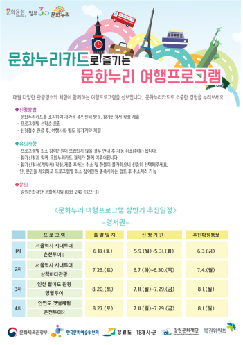 시사투데이 김준 기자] 강원문화재단은 도내 문화누리카드 이용자들에게 보다 특별한 문화향유 기회를 제공하기 위해 ‘문화누리카드 여행프로그램(기초생활수급자 및 차상위계층)’을 강원도 영서권 중심으로 9일 시범운영 한다.