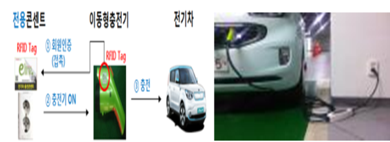이동형 충전소는 아파트, 빌딩의 주차장 등 기존 콘센트에 수량에 관계없이 이동형 충전기 사용을 위한 인식표 RFID 태그를 부착해 태그가 부착된 장소 어디서든 충전이 가능한 충전소다. 고정식 충전소처럼 지정주차 공간 확보가 불필요하고 전기요금은 이용자별 요금이 부과되며 시설 설치비는 전액 무료다.