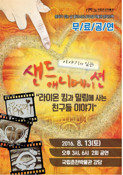 시사투데이 김준 기자] 국립춘천박물관은 ‘문화가 있는 날’ 플러스(+)토요일 박물관 문화산책으로 기획된 샌드애니메이션 무료공연인‘라이온 킹과 밀림에 사는 친구들 이야기’를 13일 개최한다.