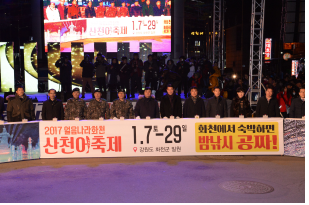 최문순 화천군수는 “선등거리 점등식은 우리 화천군민 모두의 소망을 담은 산천어등이 하늘로 비상하는 의미를 가진다”며 “화천군민과 군장병들이 새해에는 꼭 소망을 이루고 복 많이 받으시길 기원한다”고 했다.