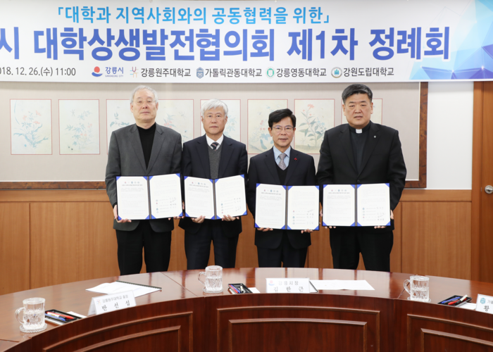 [시사투데이 김준 기자] 26일 강릉시청 시민사랑방에서 강릉원주대, 가톨릭관동대, 강릉영동대, 강원도립대 4개 대학교가 ‘강릉시 대학상생발전협의회’를 구성하고 제1차 정례회를 개최했다.