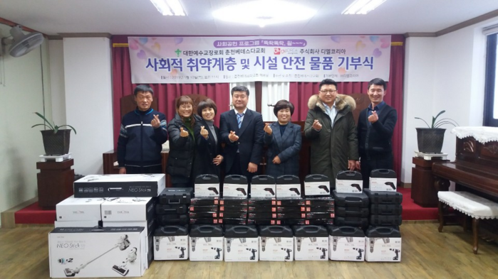 [시사투데이 김준 기자] 춘천베데스다교회는 10일 오전 11시 예배실에서 ㈜디엘코리아와 함께 사회공헌 프로그램 ‘뚝딱뚝딱, 윙~~~’을 통해 ‘사회적 취약계층 및 시설 안전 물품 기부식’을 가졌다.
