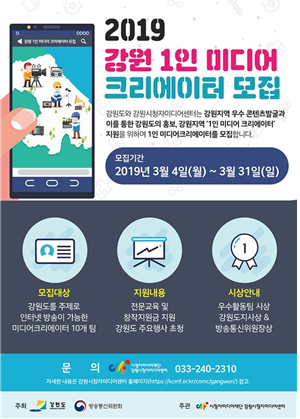 [시사투데이 김준 기자] 강원도와 강원시청자미디어센터는 강원지역 우수 콘텐츠 발굴과 1인 미디어크리에이터 양성을 위해 오는 31일까지 강원시청자미디어센터 홈페이지를 통해 ‘2019 1인 미디어 크리에이터’를 모집 중이다.