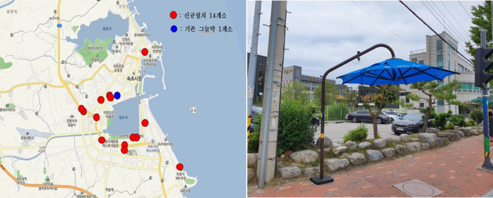 이번 여름철 폭염대책으로는 재난안전특별교부세를 투입해 중심 시가지 횡단보도, 교통섬 등 14개소에 그늘막 설치를 완료했고 무더위쉼터 80개소에 대해 각종 냉방비 지원 등을 지원한다.