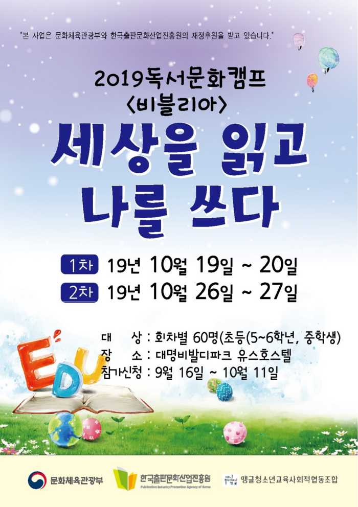 [시사투데이 김준 기자] 맹글청소년교육사회적협동조합은 오는 10월 19일부터 20일, 26일부터 27일 2차에 걸쳐 ‘세상을 읽고 나를 쓰다’라는 주제로 ‘2019년 비블리아 독서문화 캠프’를 운영한다.
