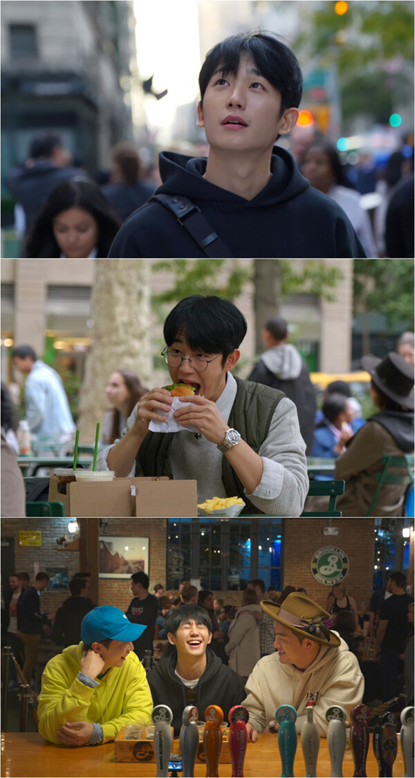 그런가 하면 세 친구 정해인-은종건-임현수는 수더분하고 꾸밈없는 케미로 호응을 얻고 있다. 정해인은 친구들 앞에서 숨겨왔던 수다본능을 끄집어내며 ‘배우 정해인’과 확연히 구분되는 ‘청년 정해인’의 모습을 보여주고 있다. 또한 실제 뉴욕에서 유학생활을 한 ‘뉴욕형’ 은종건은 초심자 정해인-임현수의 든든한 기댈 구석이 되어주는가 하면, 은근한 장난기로 정해인과 티격태격하며 웃음을 유발하고 있다. 무엇보다 ‘시골쥐 막둥이’ 임현수는 형들은 물론 시청자들까지 엄마 미소를 짓게 만드는 순박하고 긍정적인 매력으로 ‘정해인의 걸어보고서’에 신선한 웃음을 더하고 있다.