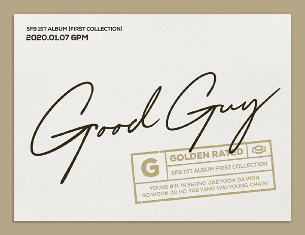 공개된 포스터는 심플한 배경 위로 ‘굿 가이(Good Guy)’라는 타이틀곡명이 적혀있다. 특히 SF9만이 부여받을 수 있는 ‘GOLDEN 등급(GOLDEN RATED)’의 등급 스탬프가 찍혀있어 새 콘셉트에 대한 궁금증과 기대감을 유발한다.