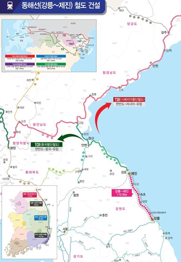 ‘강릉~제진’은 한반도와 유럽을 잇는 동해선 철도의 유일한 단절 구간이다. 기존 강릉선 KTX, 춘천~속초 동서고속화철도, 동해선 등과 연계돼 동북아 물류 중심으로 부상할 것으로 기대된다.
