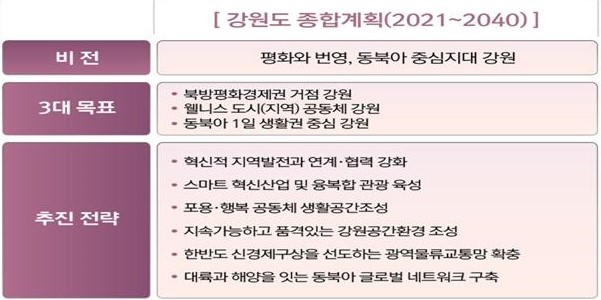 이날 발표되는 보고회에서는 ‘평화와 번영, 동북아 중심지대 강원’이라는 비전 아래 ‘북방평화경제권 거점, 웰니스 도시(지역)공동체, 동북아 1일 생활권 중심’을 3대 목표로 설정하고 6대 발전전략을 제시한다.