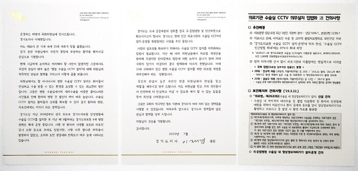 이 지사는 편지에서 "병원 수술실 CCTV 설치는 환자들이 안심하고 수술받을 수 있는 환경을 조성할 수 있는 최소한의 방안"이라며 "사업의 실효성을 확보하기 위해서는 수술실 CCTV 설치를 의무화하는 입법이 필요하다"고 했다.
