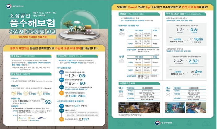 보험에 가입하지 않은 시설은 최소 생계비 수준의 정부 재난지원금만 받지만 풍수해보험에 가입한 경우 상가 1억원, 공장 1억5천만원, 재고자산 5천만원 내에서 실손 보상을 받을 수 있다.