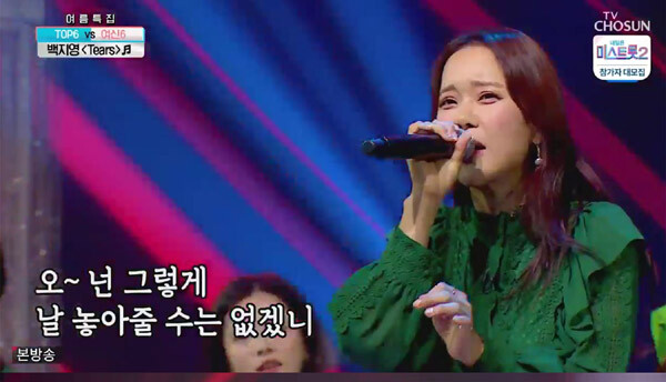 백지영은 6일 방송된 TV조선 ‘신청곡을 불러드립니다 - 사랑의 콜센타’에서 소찬휘의 ‘Tears’로 2차전 대결을 펼쳤다.