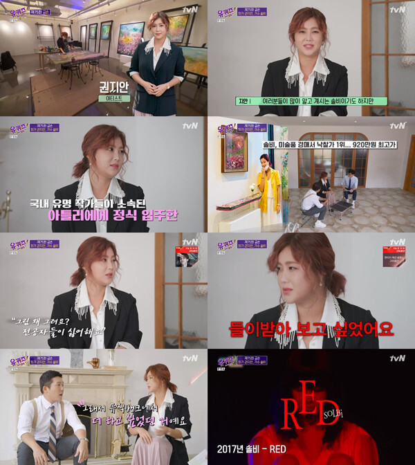 솔비는 지난 7일 방송된 tvN '유 퀴즈 온 더 블럭(이하 '유퀴즈')'의 '금손 특집'에 출연해 화가 권지안의 삶을 유쾌하면서 진정성 있게 전했다. '방송인 솔비'과 '아티스트 권지안' 두 자아를 넘나들며 새로운 웃음을 선사했다.