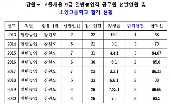 이에 소양고의 일반농업직 공무원 합격생은 2013년 1명, 2014년 3명, 2015년 4명(국가직 1명 포함), 2016년 2명, 2017년 3명, 2018년 2명, 지난해 2명 등 올해까지 총 19명이다. 특히 올해 강원도 9급 일반농업직 선발 정원은 4명으로 소양고 학생들이 합격자 50%를 차지했다.