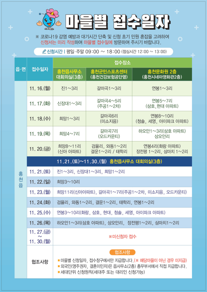 자세한 사항은 홍천군 홈페이지 또는 해당 읍면사무소에서 확인이 가능하다. 신청일과 마을별로 접수장소가 다르기 때문에 방문 전 접수장소를 꼭 확인해야 한다.